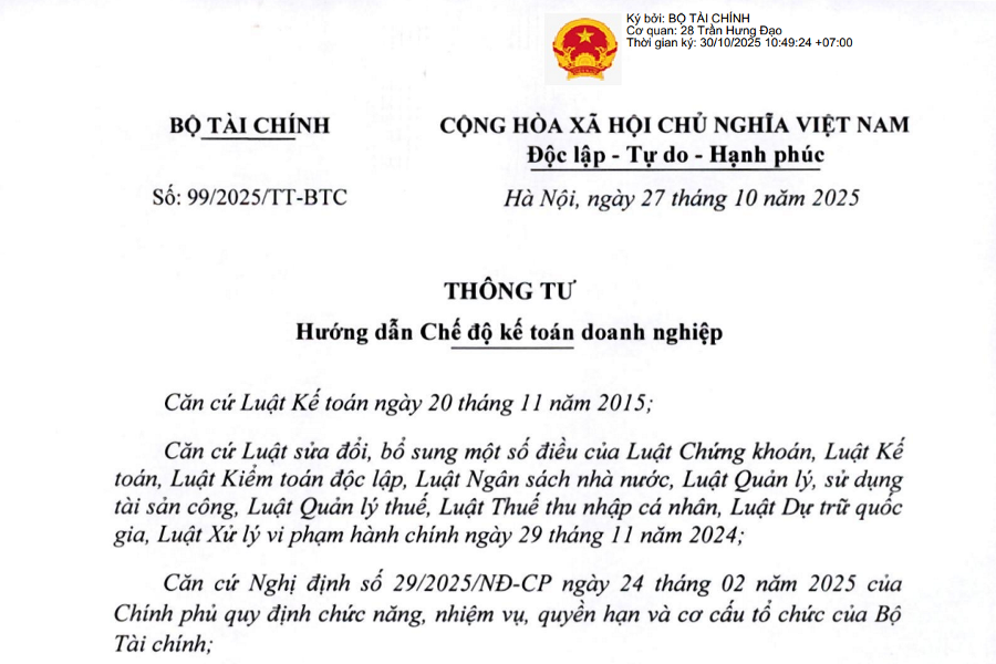 Thông tư 99 Hướng dẫn chế độ kế toán doanh nghiệp áp dụng từ ngày 01 tháng 01 năm 2026