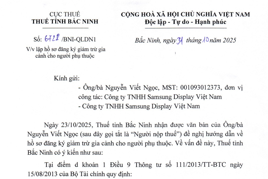 CỤC THUẾ THUẾ TỈNH BẮC NINH Số: 6728/BNI-QLDN1 V/v lập hồ sơ đăng ký giảm trừ gia cảnh cho người phụ thuộc CỘNG HOÀ XÃ HỘI CHỦ NGHĨA VIỆT NAM...