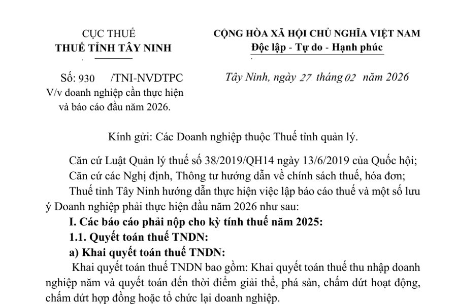CỤC THUẾ THUẾ TỈNH TÂY NINH Số: 930 /TNI-NVDTPC V/v doanh nghiệp cần thực hiện và báo cáo đầu năm 2026. CỘNG HÒA XÃ HỘI CHỦ NGHĨA VIỆT NAM Độc...