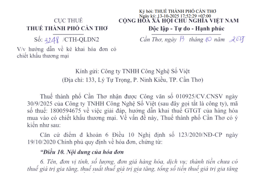 CỤC THUẾ THUẾ THÀNH PHỐ CẦN THƠ Số: 3248 /CTH-QLDN2 V/v hướng dẫn về kê khai hóa đơn có chiết khấu thương mại CỘNG HÒA XÃ HỘI CHỦ NGHĨA VIỆT...