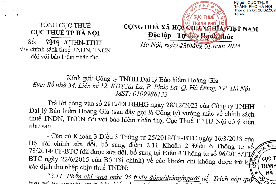 Công văn 8974 Hướng dẫn thuế TNDN thuế TNCN về bảo hiểm nhân thọ