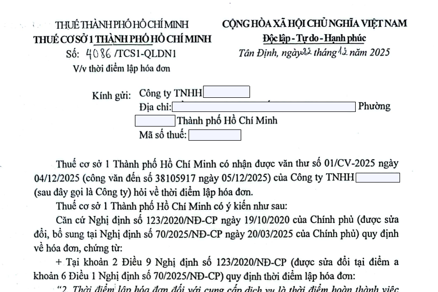 THUẾ THÀNH PHỐ HỒ CHÍ MINH THUẾ CƠ SỞ 1 THÀNH PHỐ HỒ CHÍ MINH Số: 4086 /TCS1-QLDN1 V/v thời điểm lập hóa đơn CỘNG HÒA XÃ HỘI CHỦ NGHĨA...
