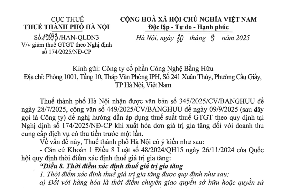Công văn 19693 hướng dẫn thuế suất khi xuất hóa đơn GTGT đối với cung cấp dịch vụ có thu tiền trước một lần