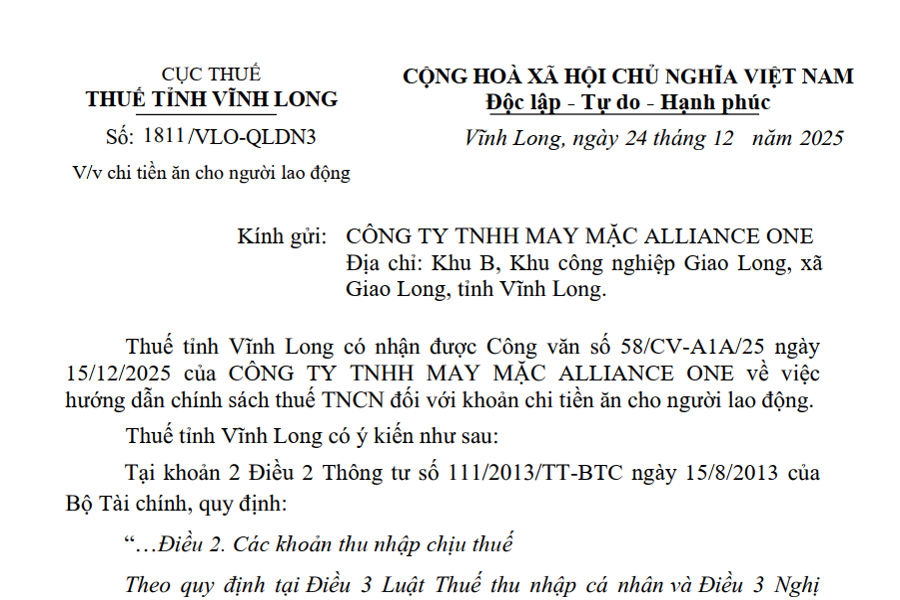 Công văn 1811 Chỉ tiền ăn trưa, ăn giữa ca không chịu thuế TNCN, ăn sáng và ăn tối không được áp dụng