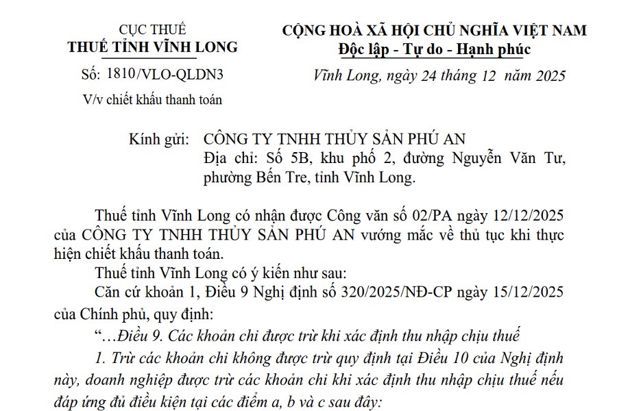 CỤC THUẾ THUẾ TỈNH VĨNH LONG Số: 1810/VLO-QLDN3 V/v chiết khấu thanh toán CỘNG HOÀ XÃ HỘI CHỦ NGHĨA VIỆT NAM Độc lập – Tự do – Hạnh phúc Vĩnh...
