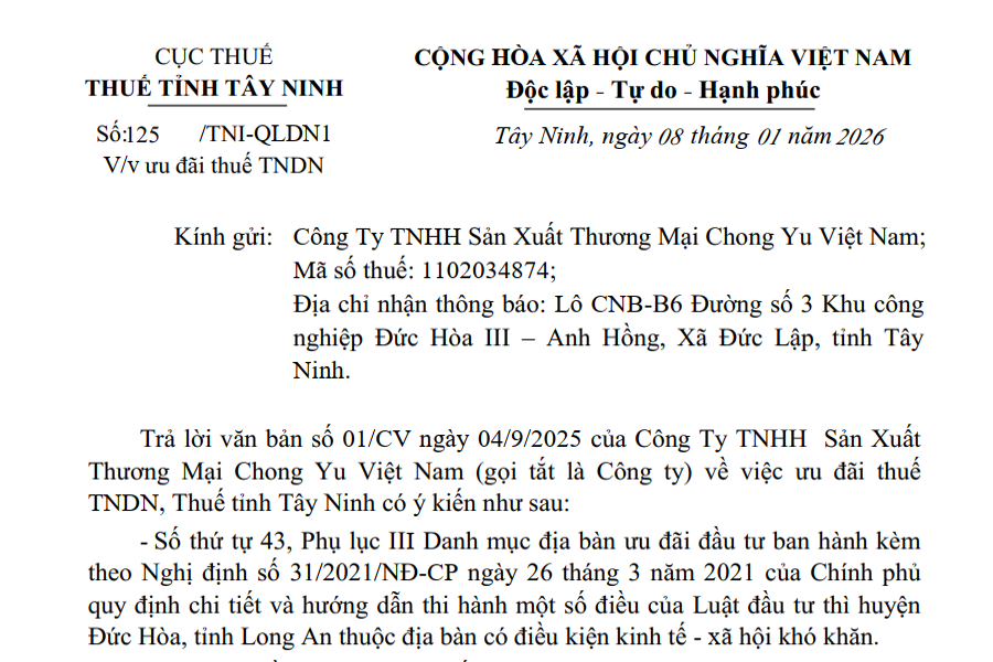 CỤC THUẾ THUẾ TỈNH TÂY NINH CỘNG HÒA XÃ HỘI CHỦ NGHĨA VIỆT NAM Độc lập – Tự do – Hạnh phúc Số: 125/TNI-QLDN1 V/v ưu đãi thuế TNDN Tây...