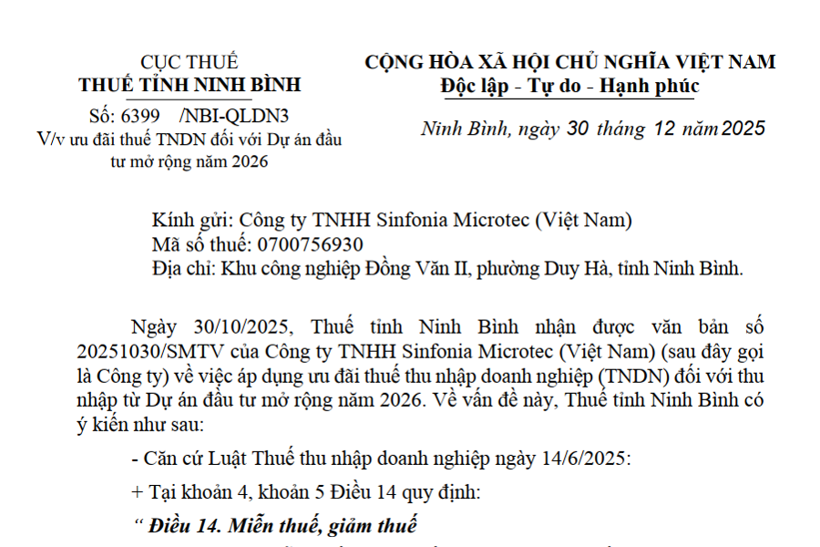 CỤC THUẾ THUẾ TỈNH NINH BÌNH Số: 6399 /NBI-QLDN3 V/v ưu đãi thuế TNDN đối với Dự án đầu tư mở rộng năm 2026 CỘNG HÒA XÃ HỘI CHỦ NGHĨA...