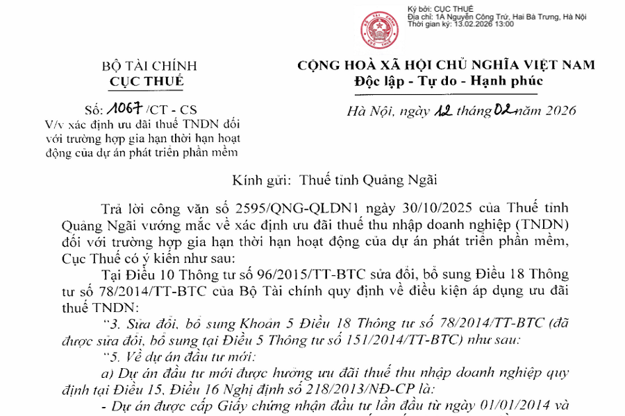 Công văn 1067 về không được hưởng ưu đãi đầu tư dự án phần mềm đối với thời gian được gia hạn đầu tư