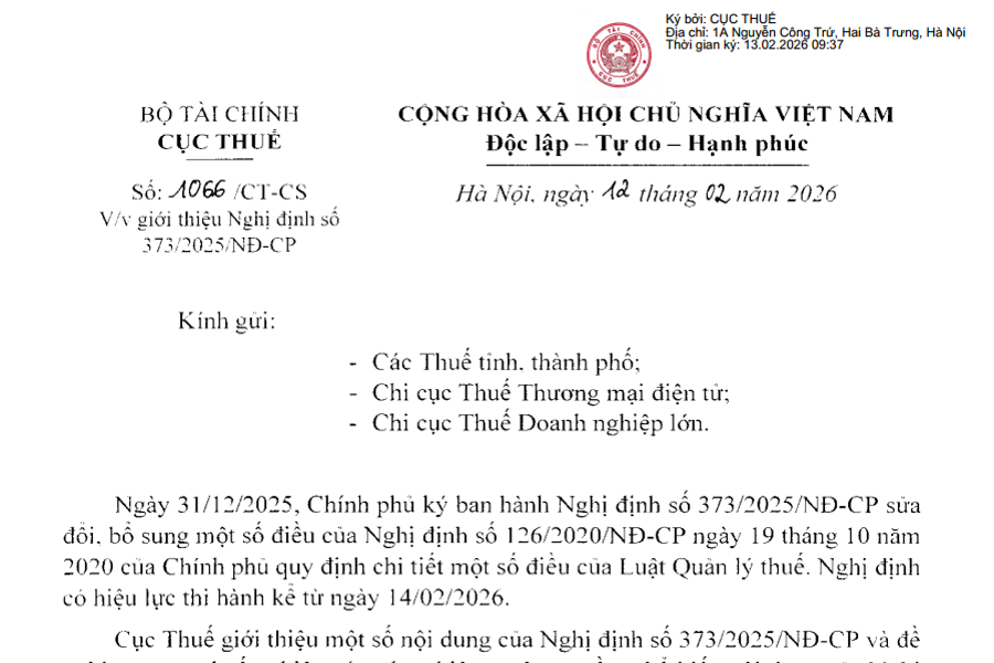 BỘ TÀI CHÍNH CỤC THUẾ_______ Số: 1066/CT-CS V/v giới thiệu Nghị định số 373/2025/NĐ-CP CỘNG HÒA XÃ HỘI CHỦ NGHĨA VIỆT NAM Độc lập – Tự do – Hạnh phúc_________________Hà...