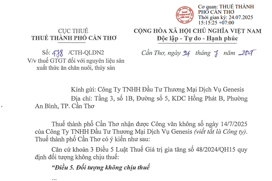 CỤC THUẾ THUẾ THÀNH PHỐ CẦN THƠ Số: 478 /CTH-QLDN2 V/v thuế GTGT đối với nguyên liệu sản xuất thức ăn chăn nuôi, thủy sản CỘNG HÒA XÃ HỘI CHỦ...