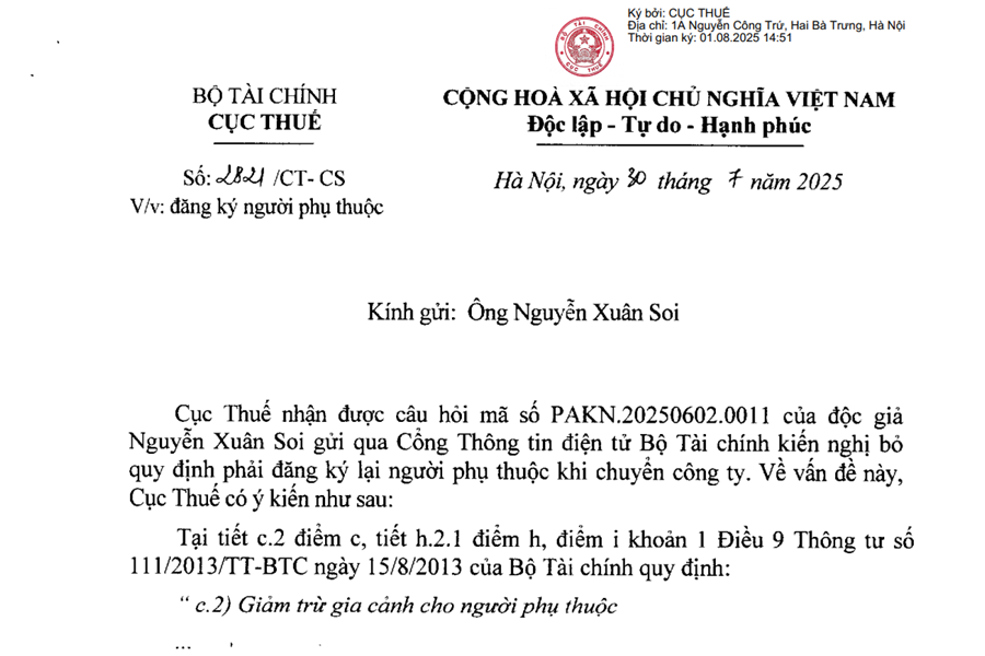 Công văn 2821 Về việc đăng ký người phụ thuộc sau khi thay đổi nơi làm việc