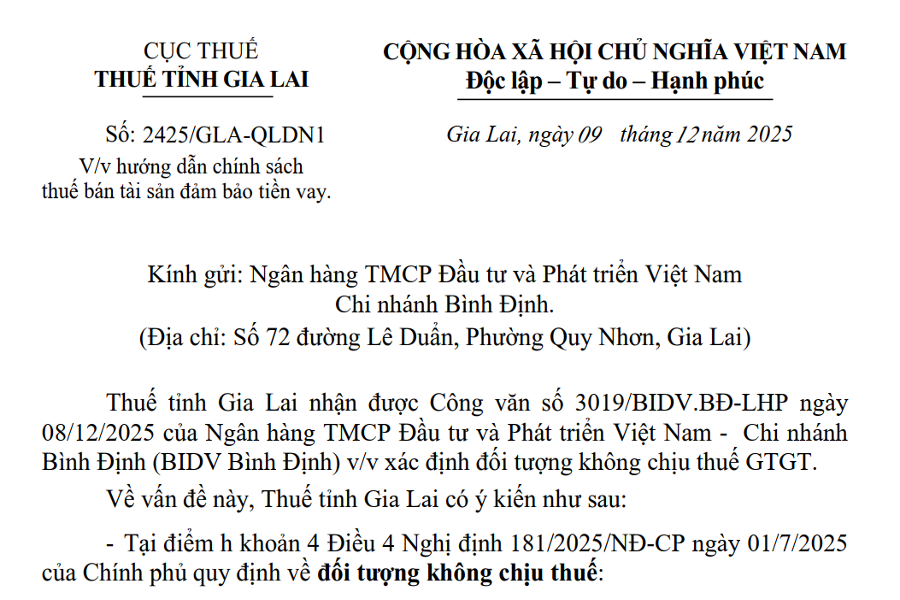 Công văn 2425 hướng dẫn chính sách thuế bán tài sản đảm bảo tiền vay.