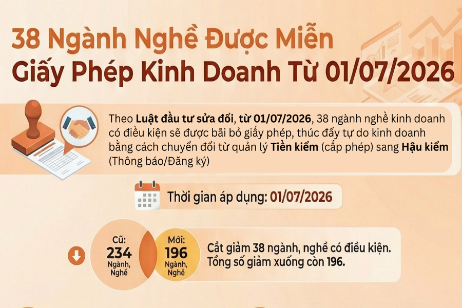 38 ngành, nghề được miễn giấy phép kinh doanh từ 1/7/2026 Từ 1/7/2026, 38 ngành, nghề kinh doanh có điều kiện sẽ không cần xin giấy phép, được chuyển sang...