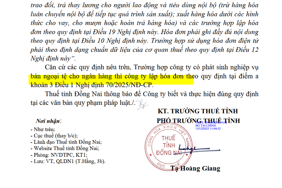Công văn 8073 doanh nghiệp xuất hóa đơn khi bán ngoại tệ cho ngân hàng